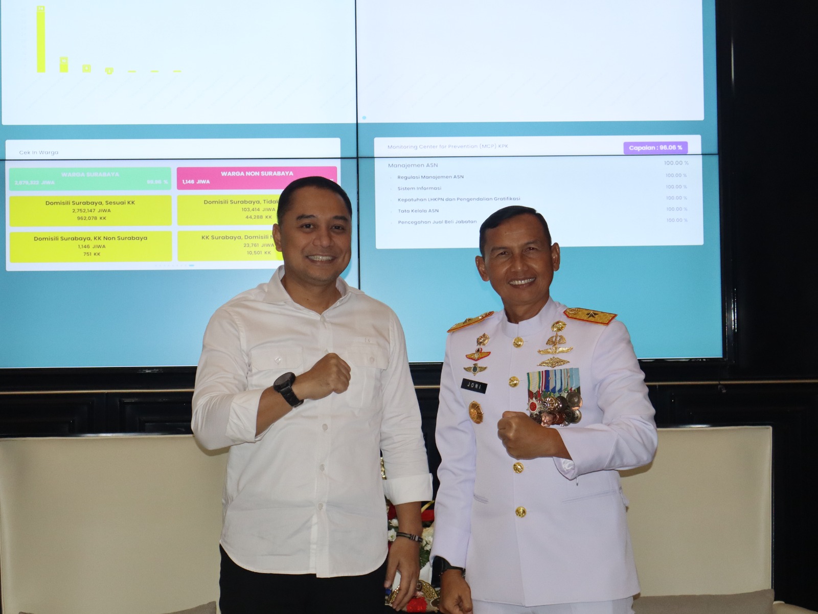 PI – Surabaya, Komandan Pangkalan Utama TNI Angkatan Laut (Danlantamal) V Brigjen TNI Marinir Joni Sulistiawan, S. H., M. Han., melaksanakan pertemuan dengan WaliKota Surabaya Bapak Eri Cahyadi, S. T., M. T., untuk mempererat silaturahmi, sebagai pejabat baru dilingkungan Kota Surabaya Jawa timur, di Balikota Surabaya Jl. Walikota Mustajab No.59, Ketabang, Kec. Genteng, Kota SBY, Jawa Timur. Jumat (01/12/2023).